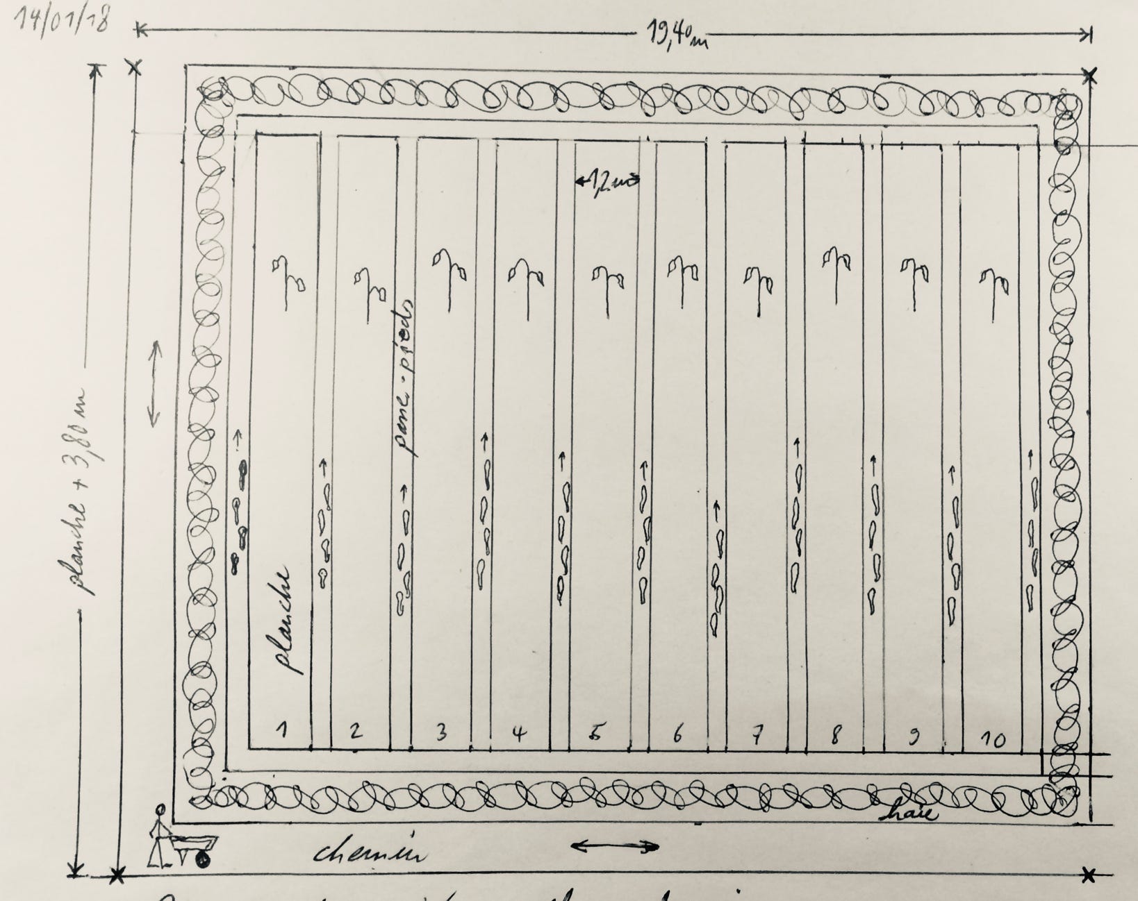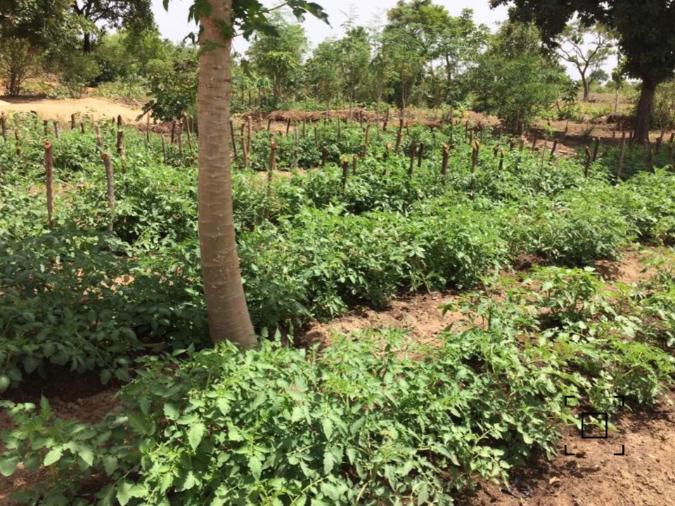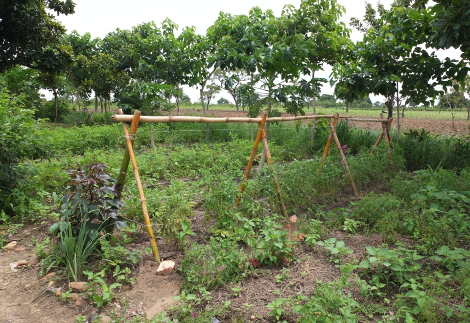 Wir haben ein Modul entwickelt, das zur Anlage größerer Gemüsegärten nicht vergrößert, sondern vervielfältigt wird. Weite Flächen sind Wind und Sonne ausgesetzt. Es ging darum, Räume für Kulturen zu schaffen, die windgeschützt sind und die harte Sonneneinstrahlung mildern. Jeweils 10 Beete mit entsprechenden Wegen werden von einer Windschutz-Hecke der Leguminose Pois d’Angole (Pigeon pea, Cajanus cajan) umgeben, die den Boden düngt, gleichzeitig auch Erbsen liefert, Blätter als Viehfutter, und Holz. In den Beeten stehen im Abstand von 3 m Moringa-Bäume, die z.T. als Stützen für Rankhilfen bei Tomaten dienen können. Mit ihren gefiederten Blättern, die ein sehr nahrhaftes Gemüse sind, beschatten sie die Kulturen leicht. Bill Mollison, Begründer der Permakultur, sagt:
