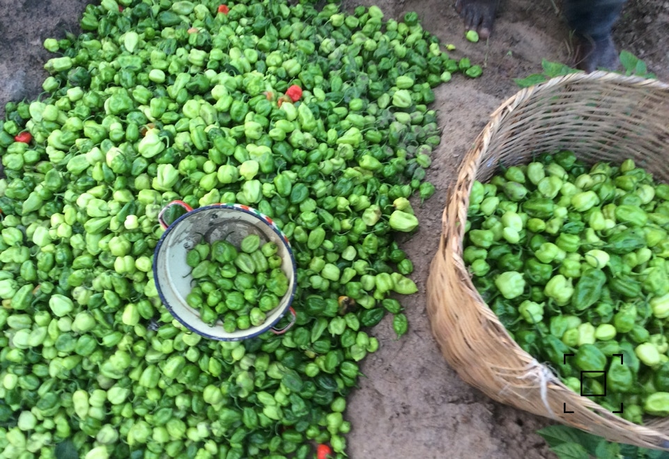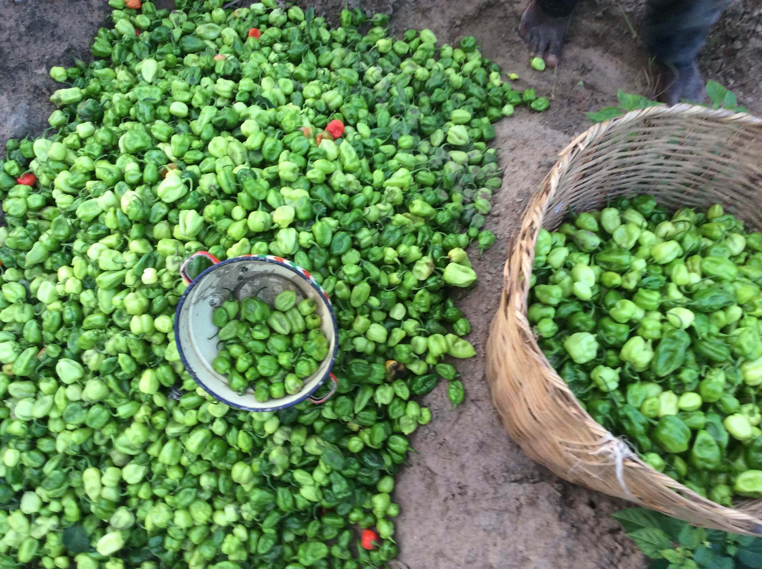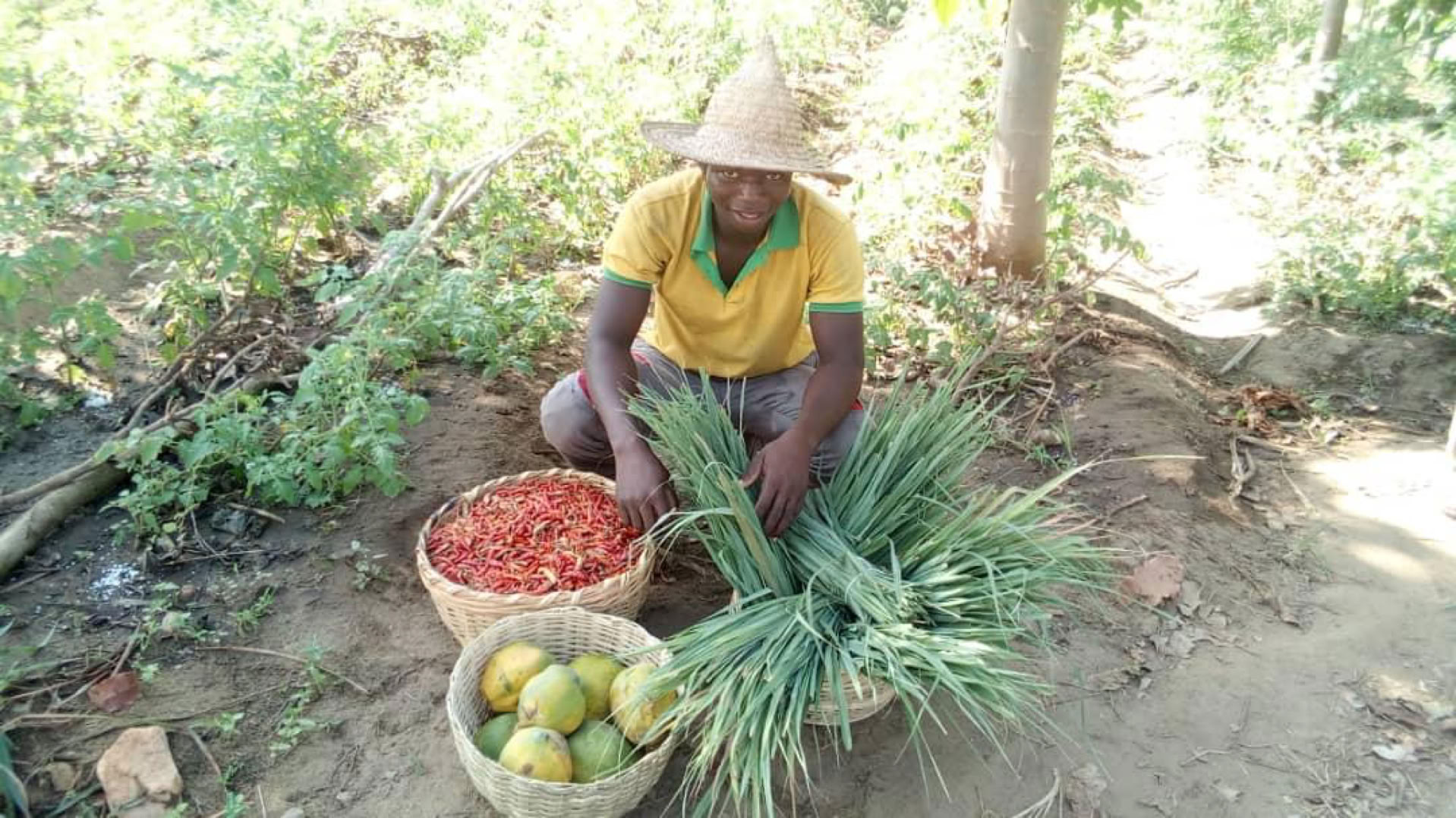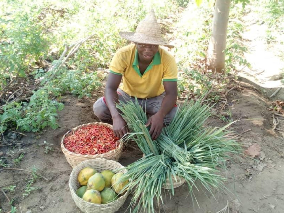 Abibou, einer unserer Gärtner, mit Peperoni „Pili-Pili“, Papayas und Zitronengras für den Markt in Copargo.