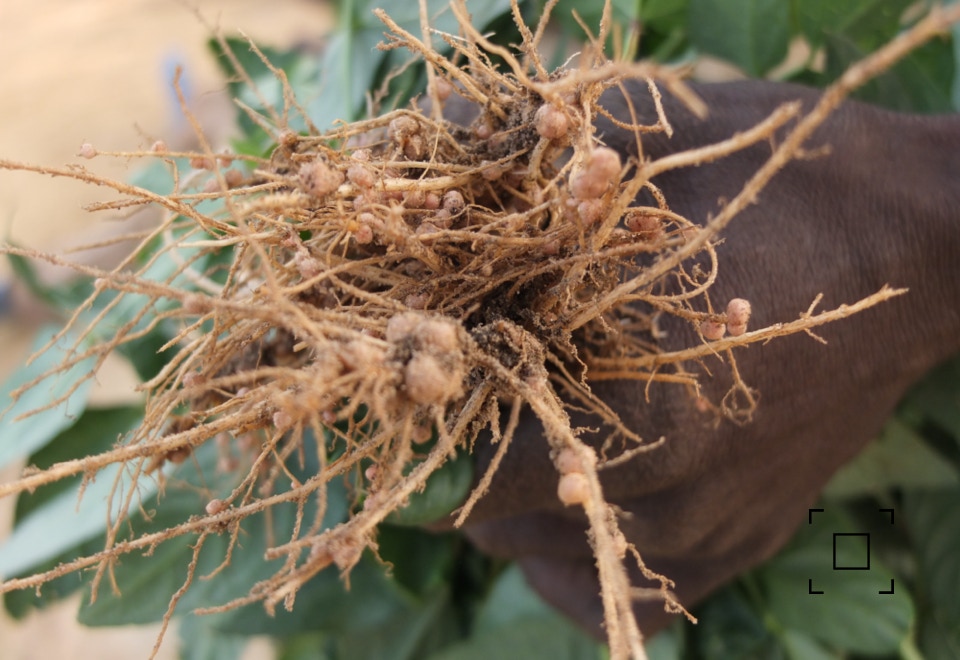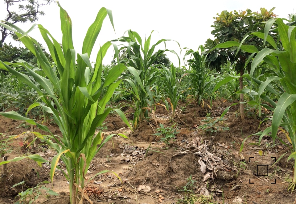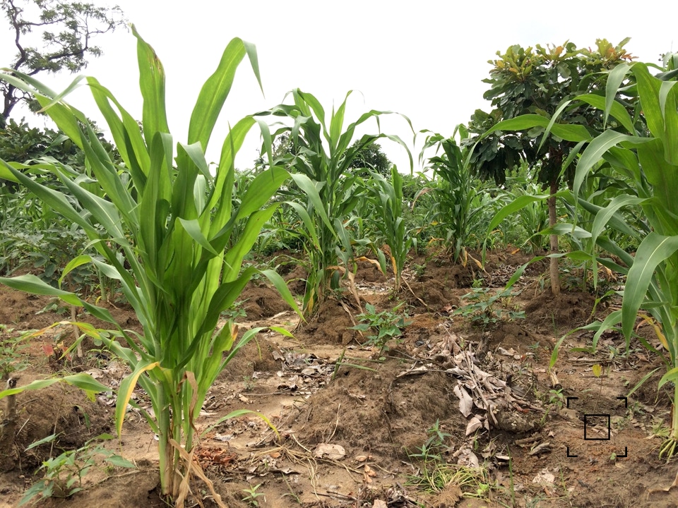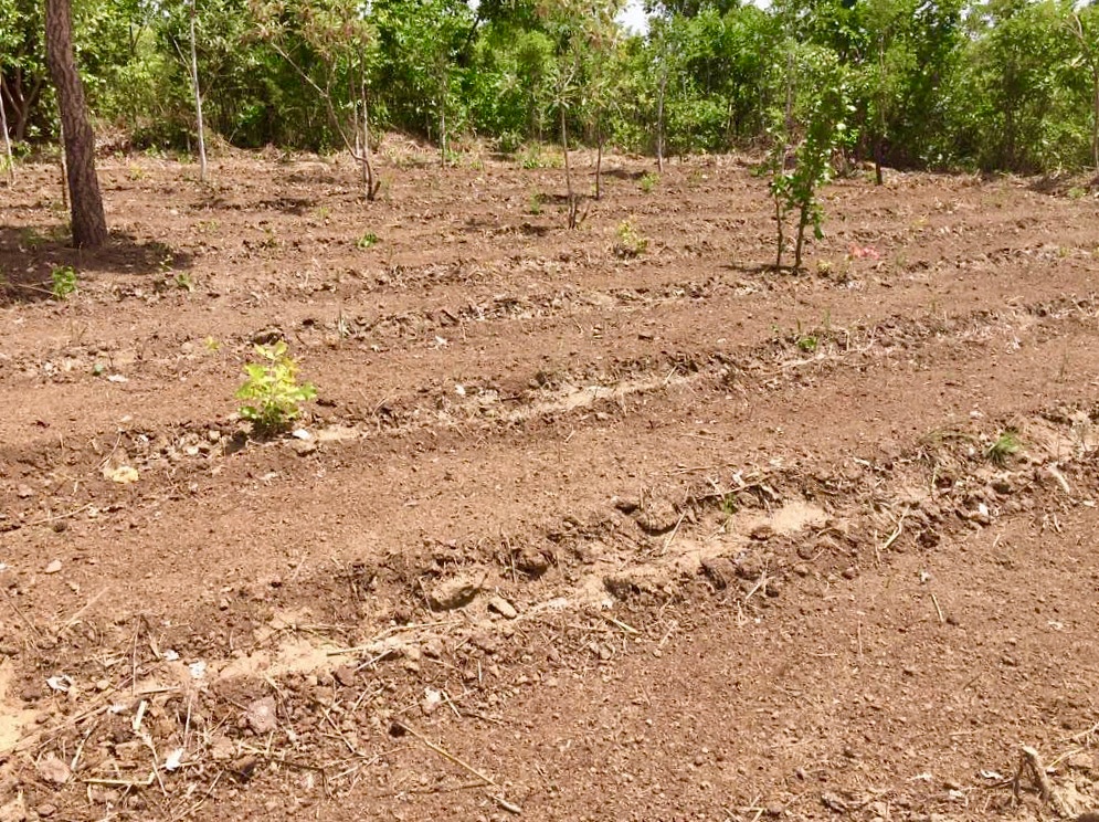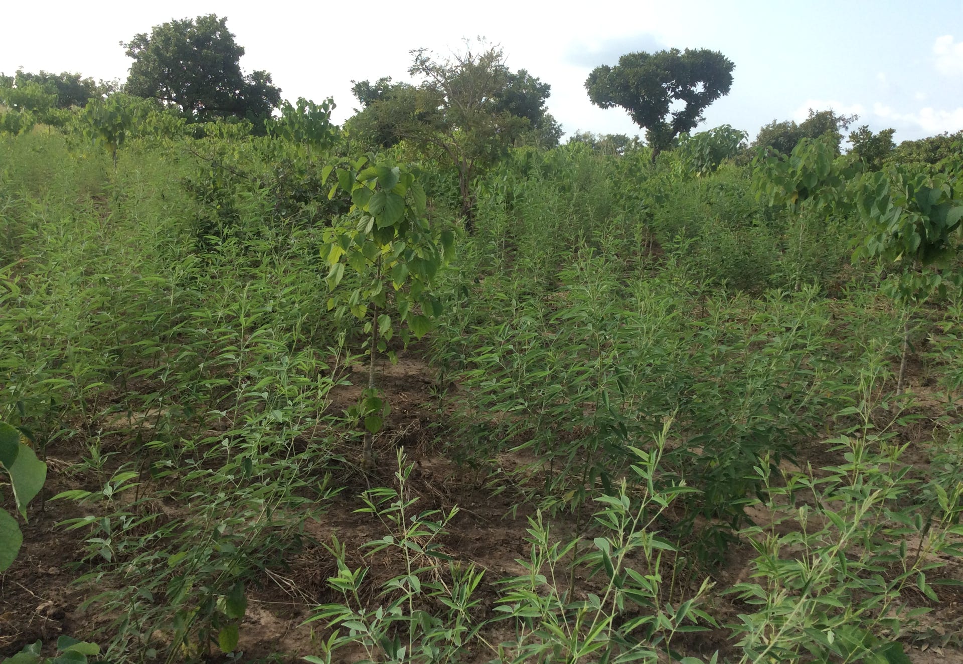 Dieselbe Parzelle 2017. Im Vordergrund „Pois d’Angole“ (Cajanus cajan, Straucherbse), eine „plante fixatrice d’azote“, eine Leguminose, die den Stickstoff aus der Luft im Boden deponiert, also den Boden düngt. Gemäß der Schule der Permakultur von Bill Mollison ist ein System dann stabil, wenn es viele Verbindungen zwischen den Elementen des Systems gibt, d.h. eine starke Vernetzung. Weizen in Monokultur, angebaut unter dem Einsatz von Herbiziden und Insektiziden, ist in diesem Sinne instabil. Wir haben die Straucherbse als Begleitkultur der Baumpflanzung eingesetzt. Die Pflanze beschattet den Boden und verringert die Verdunstung von Wasser, sie verlangsamt den Wind, sie düngt den Boden, die Erbsen sind essbar, die Blätter Tierfutter, die Zweige verholzen und sind als Brennholz nutzbar. Nützlich wie ein Huhn!