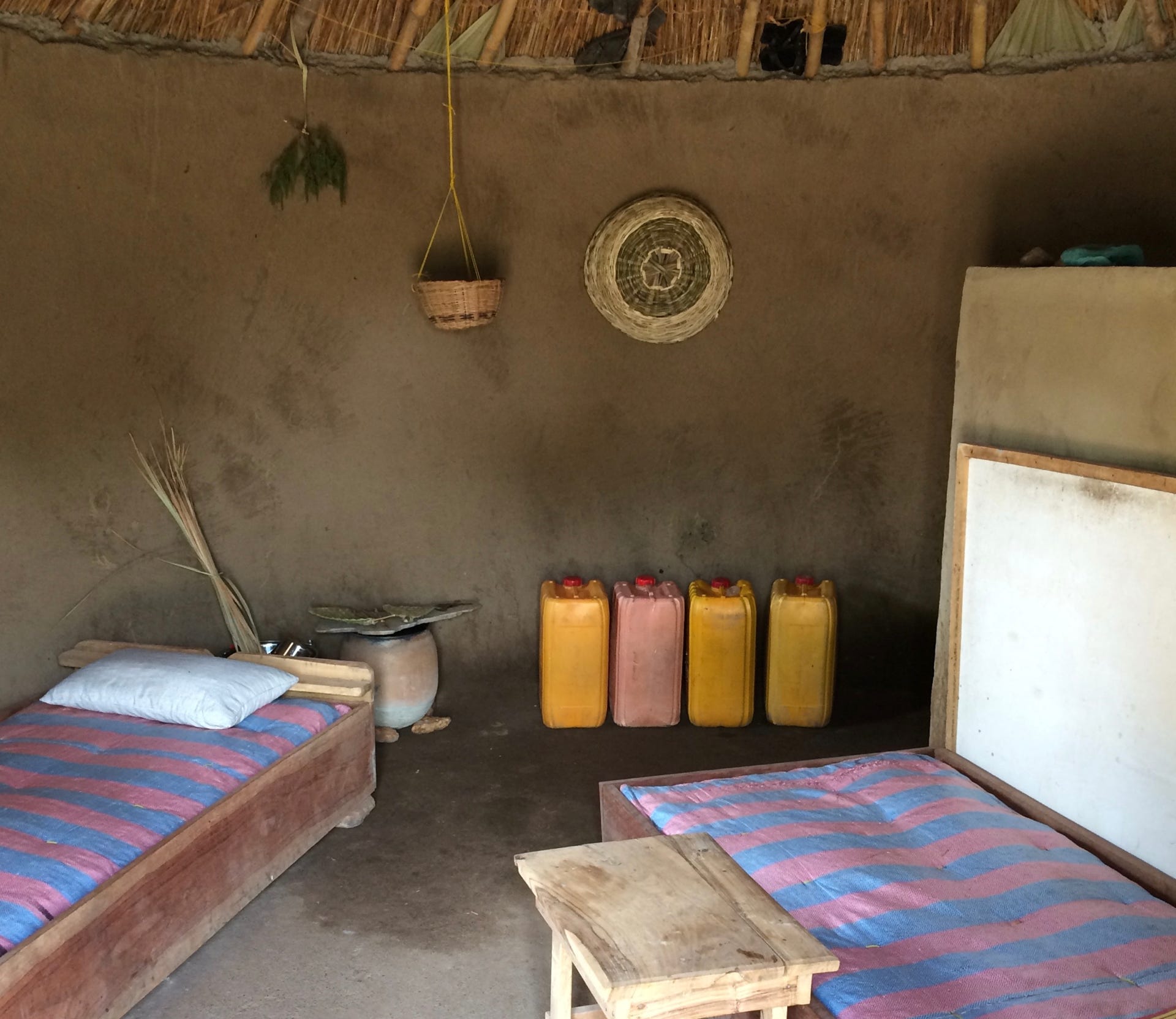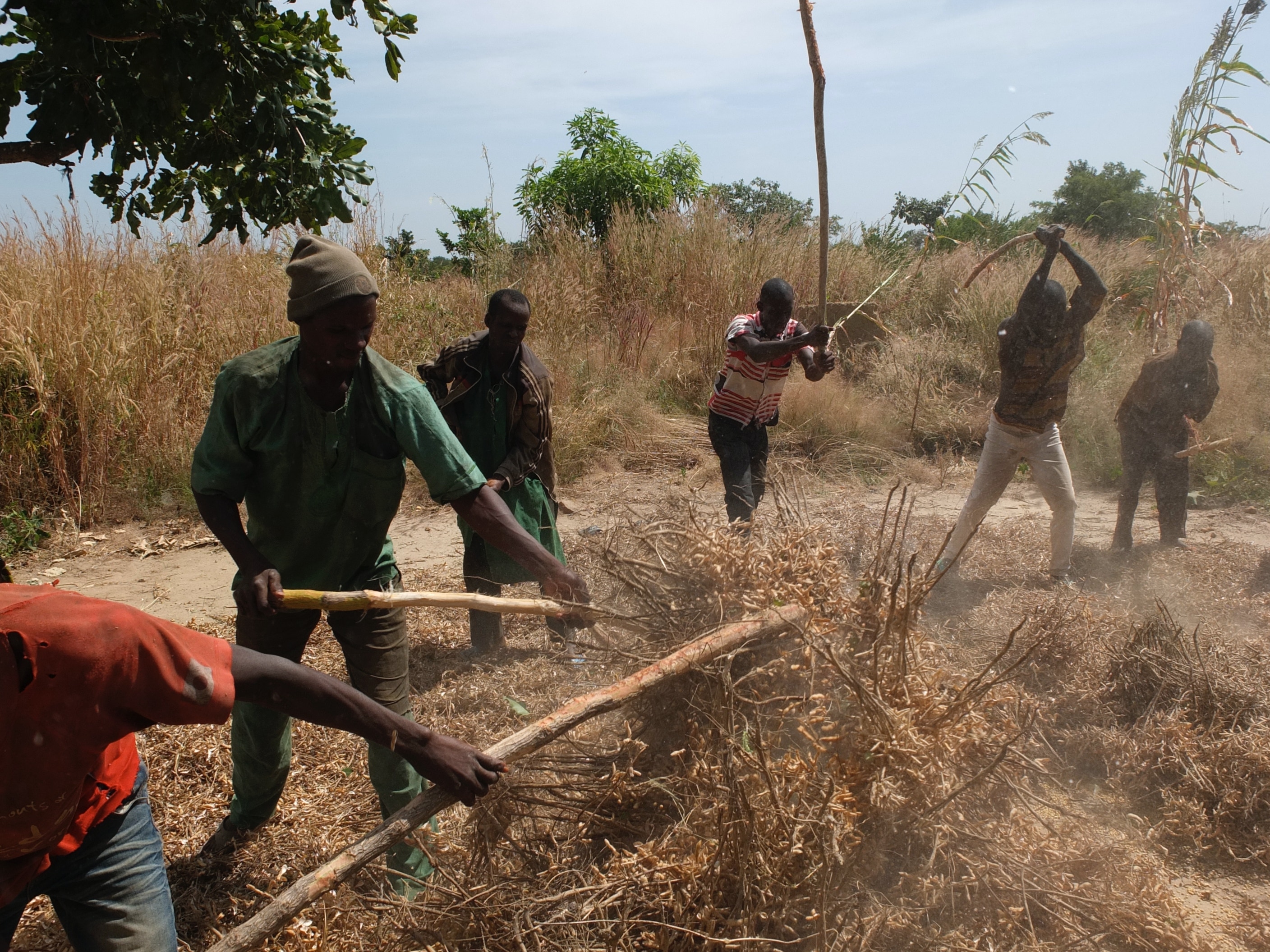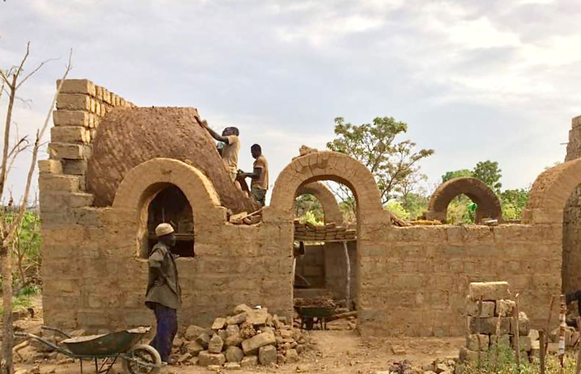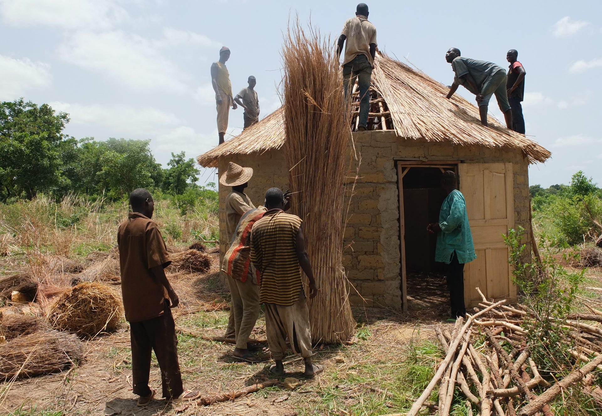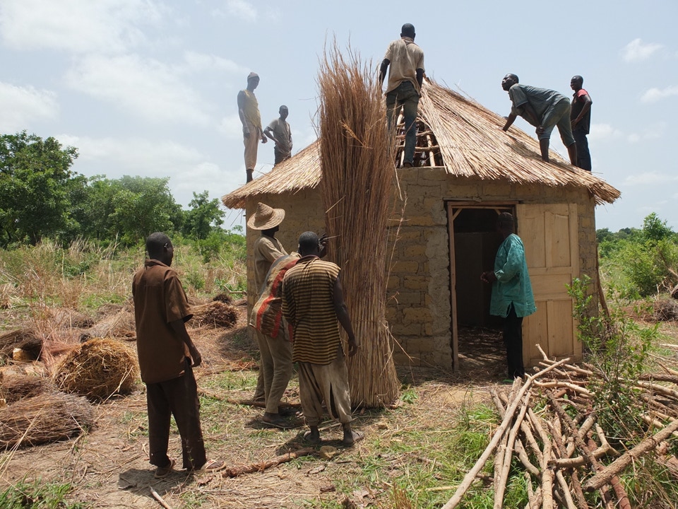 Bau eines Wohnhauses und Treffpunktes mit Ziegeln aus Lehm, Fenstern aus Holz, Dachstuhl aus Bambus und Strohdeckung. Es ist ein gängiges, nicht ungewöhnliches Haus, dennoch vereint es Techniken, die selten werden. Aufgrund des zunehmenden Einsatzes des verderblichen Glyphosats ist das geeignete Stroh (Andropogon gayanus) schwer aufzutreiben. Wir fördern das Wachstum des Grases auf unserem Grund.