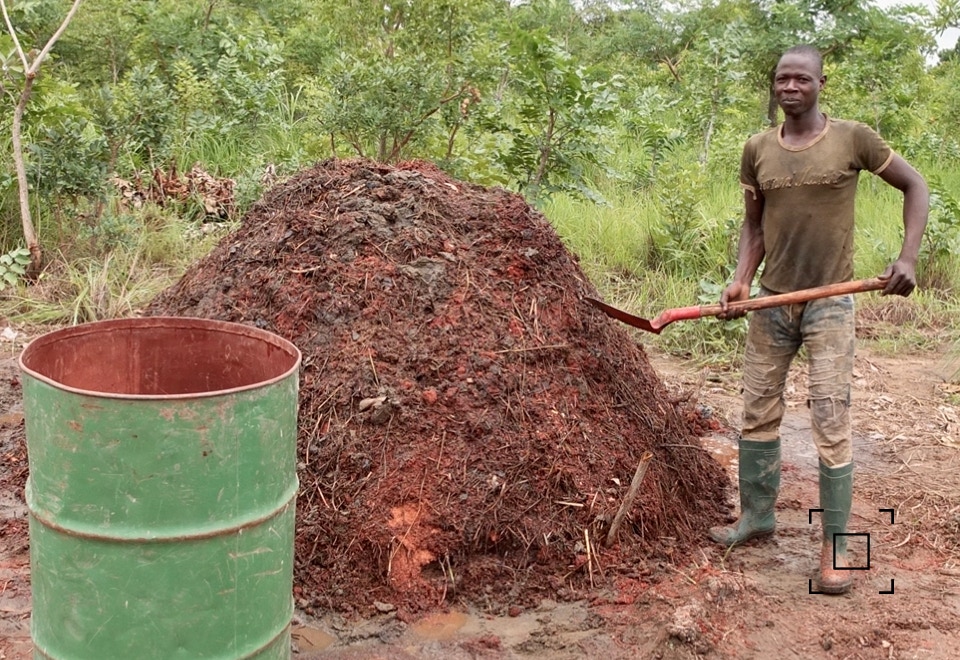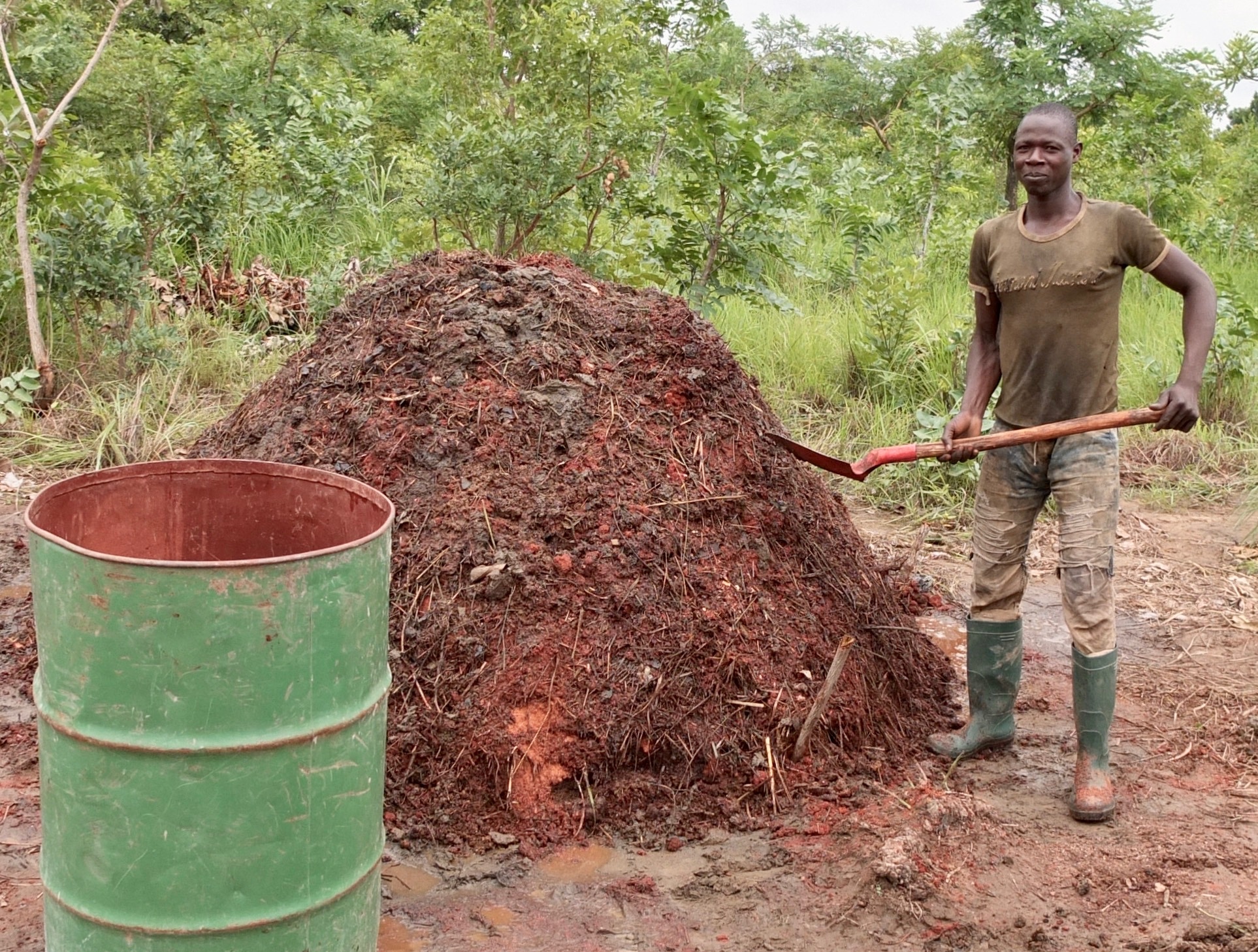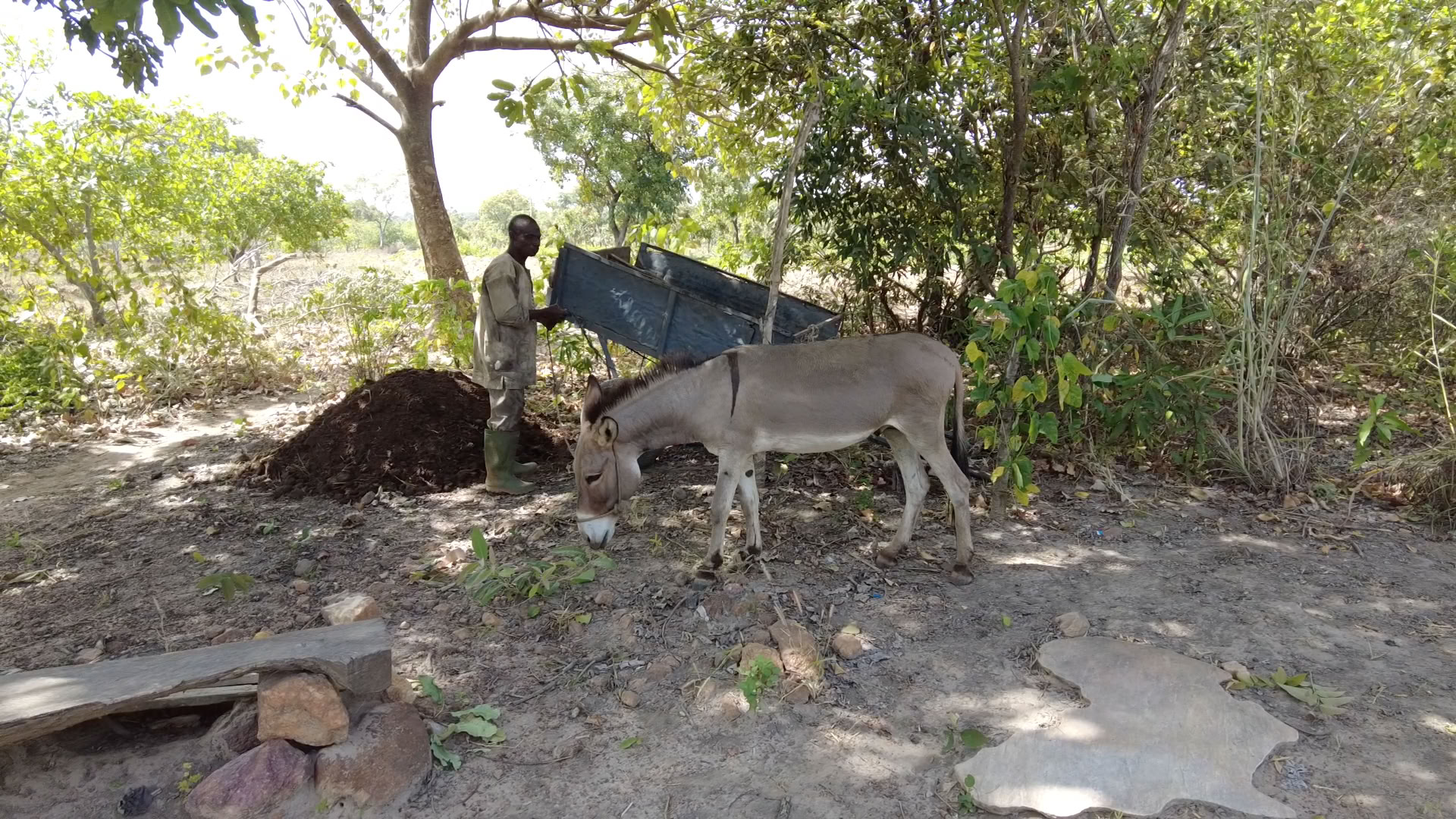 Der Mann mit dem Esel. Seit Jahren kenne ich Taïrou. Er ist der einzige in der Region, der einen Esel hat. Im November 2025 bin ich ihm wieder einmal in Copargo begegnet. Wir grüßten uns und ich ging weiter. Plötzlich dachte ich, ob er nicht in der Stadt Kompostmaterial für uns sammeln und es uns liefern könne. Ich drehte um und fragte ihn. Nun liefert er uns einmal pro Woche eine Fuhre davon, z.B. Mist von Rinderhaltern.