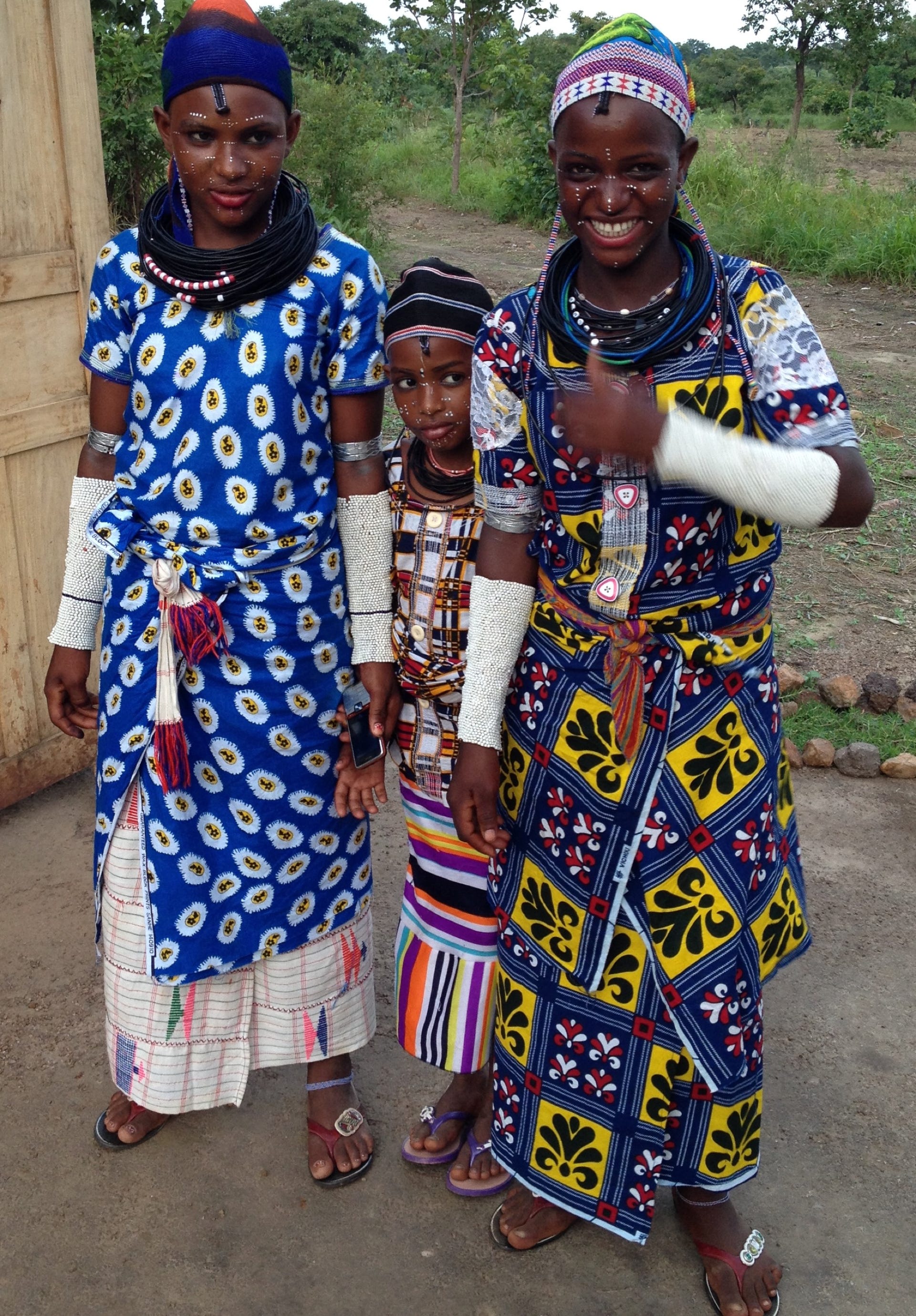Besuch aus der Nachbarschaft. Leya's Töchter. Leya ist ein sehr freundlicher Peulh (dt. Fulbe). Die Fulbe sind Rinderhirten und oft die Intellektuellen Afrikas, wie der große Amadou Hampâte Bâ, der gesagt hat: "Mit jedem Greis, der in Afrika stirbt, verbrennt eine Bibliothek." Die Kunst der Frauen, sich zu kleiden und die Freiheit, Farben zu kombinieren lässt mir nur einen Vergleich zu: die Farben von Henri Matisse.